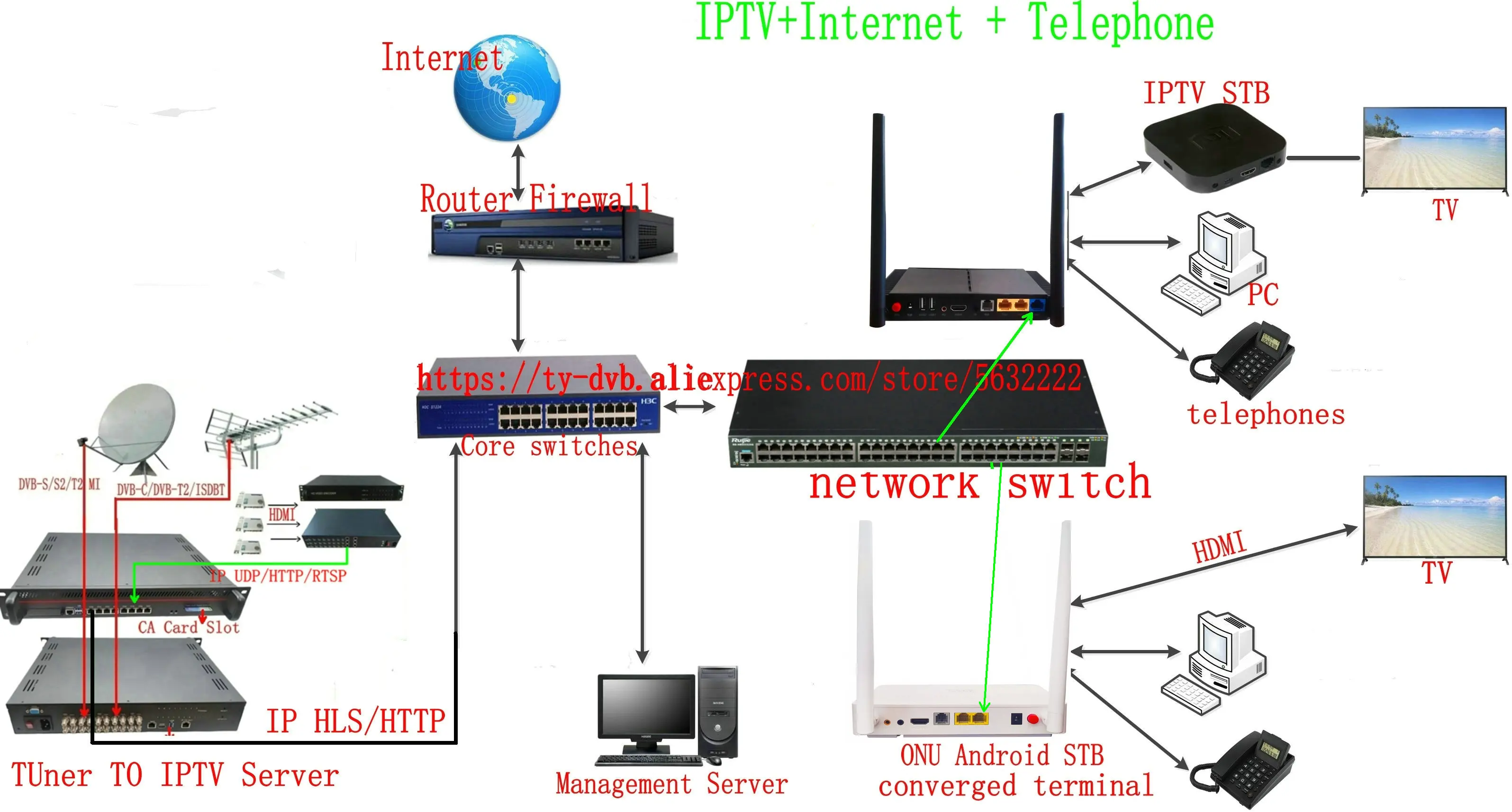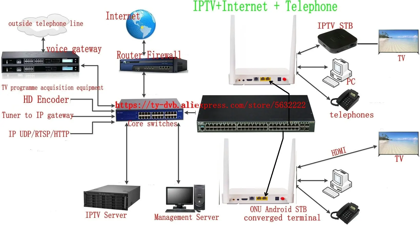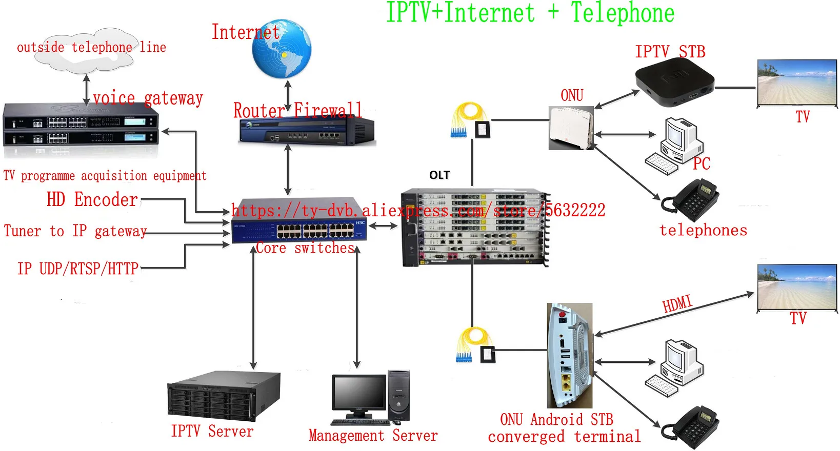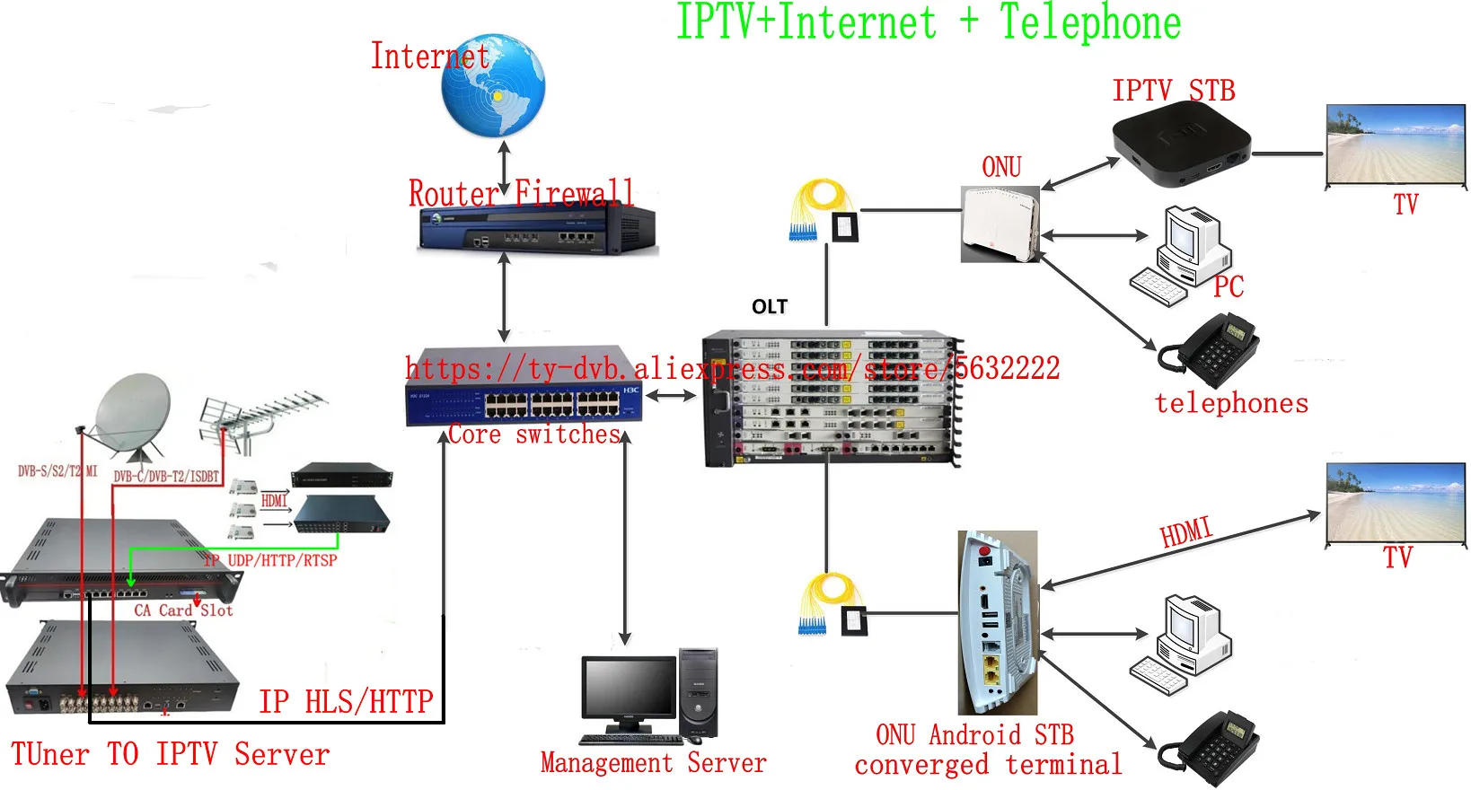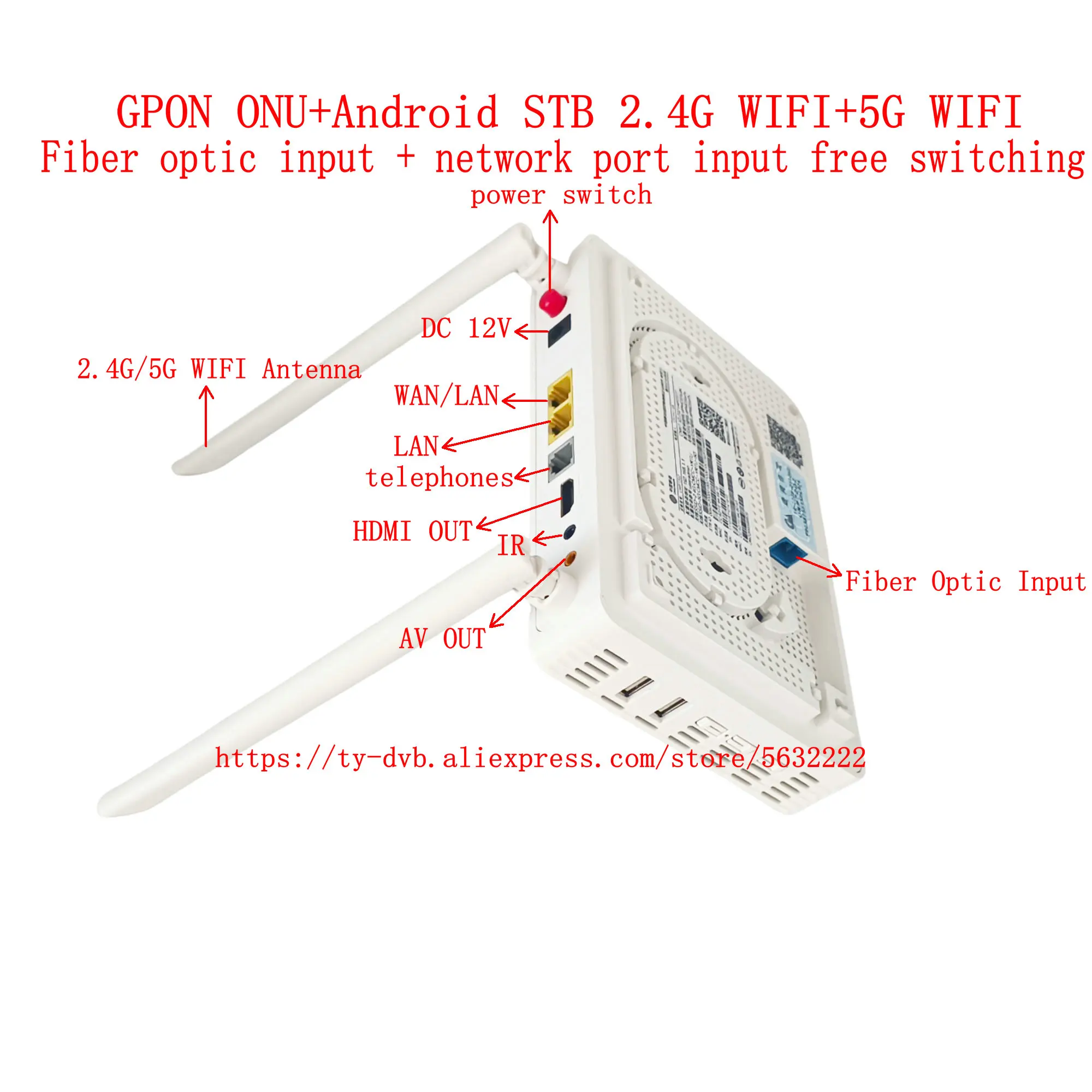 GPON ONU + IPTV Android STB 2.4G + 5G WIFI Internet + هاتف + تلفزيون ألياف بصرية + مدخل منفذ الشبكة مفتاح مجاني