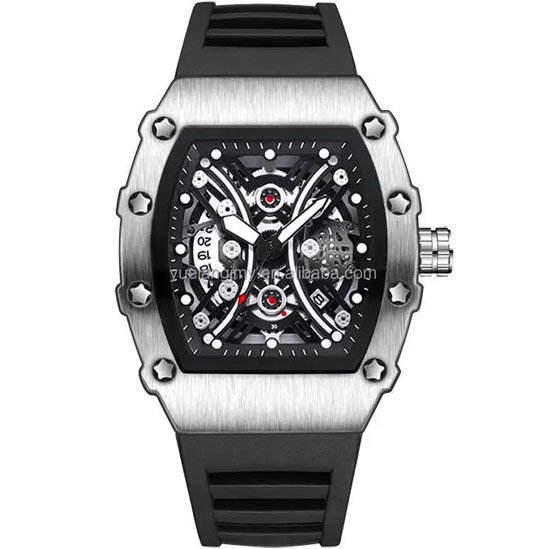 ساعة رجالية كوارتز بتصميم ميكانيكي فاخر تتميز بتصميم هندسي مبتكر مستوحى من الساعات الميكانيكية الراقية، مع واجهة داخلية معقدة تعكس الحرفية الدقيقة وروح الابتكار.
